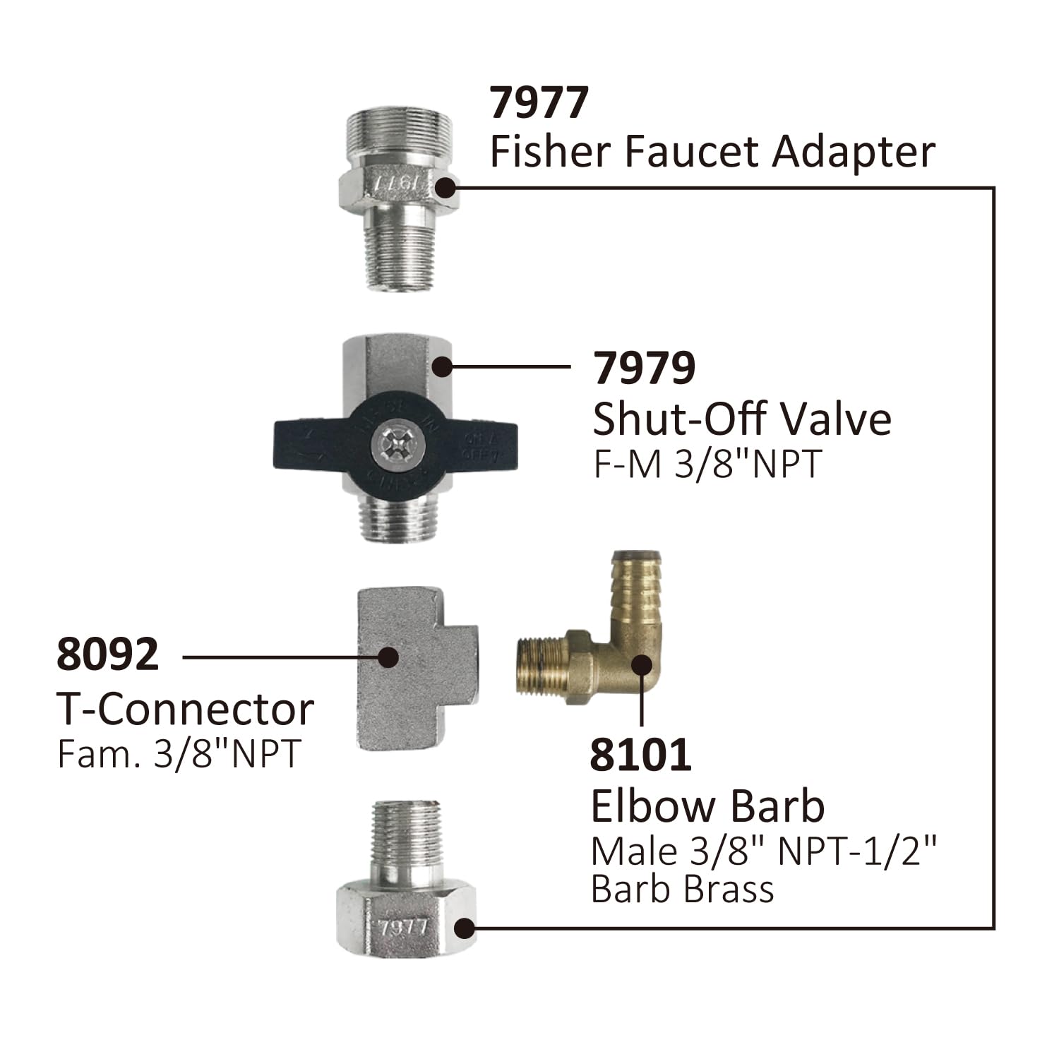 ● Package including: -7977 Fisher Faucet Adapter; -7979 Shut-Off Valve, F-M 3/8"NPT; -8092 T-Connector, Fam. 3/8"NPT; -8101 Elbow Barb, Mal. 3/8"NPT- 1/2 Barb Brass